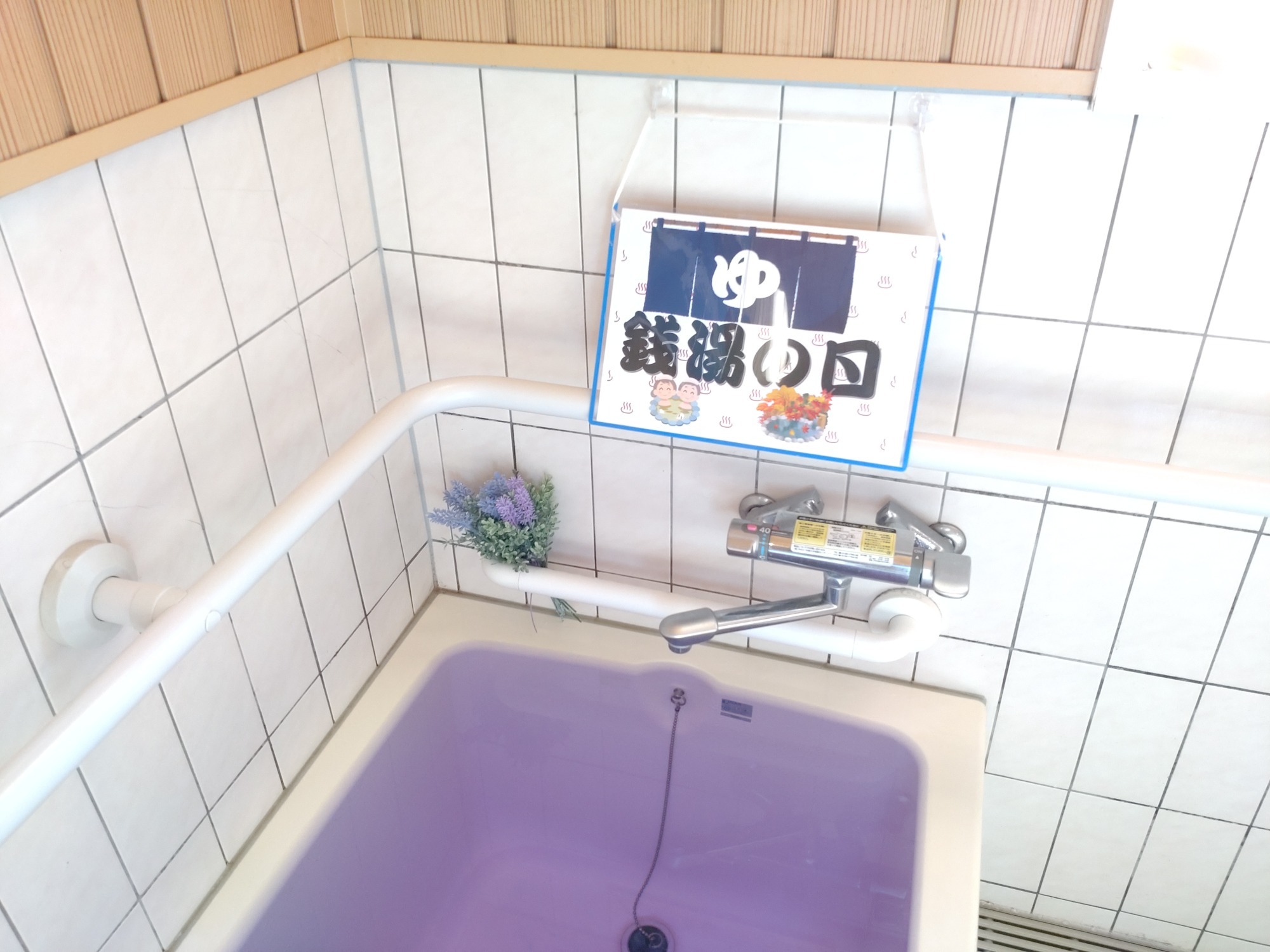 この日は、こもれびの湯では、まるで温泉旅館に早変わり。銭湯の壁画にある富士山の絵が飾られ、ご利用者様にはラベンダー風呂を楽しんでいただきました。「ラベンダー色、綺麗だね」「いい香りするな〜」と、湯気の中から聞こえてくる声に、スタッフも思わずにっこり。中には、「気持ち与三郎でございます」と、時代劇風の名セリフ(?)を披露してくださる方もいて、笑いが絶えないひとときとなりました。
