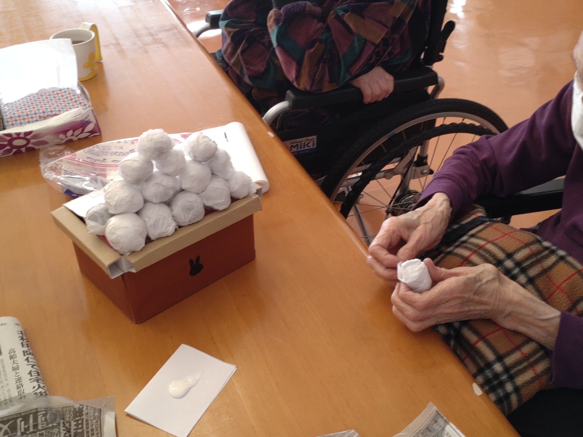 お正月の飾り付けとして、ご利用者様と一緒に壁画作りの挑戦です!段ボールをウサギの形に切り取り、綿の量を調整しながら、ボンドで貼付け。可愛らしいモフモフ・フワッフワの❝兎❞に仕上げる事が出来ました。