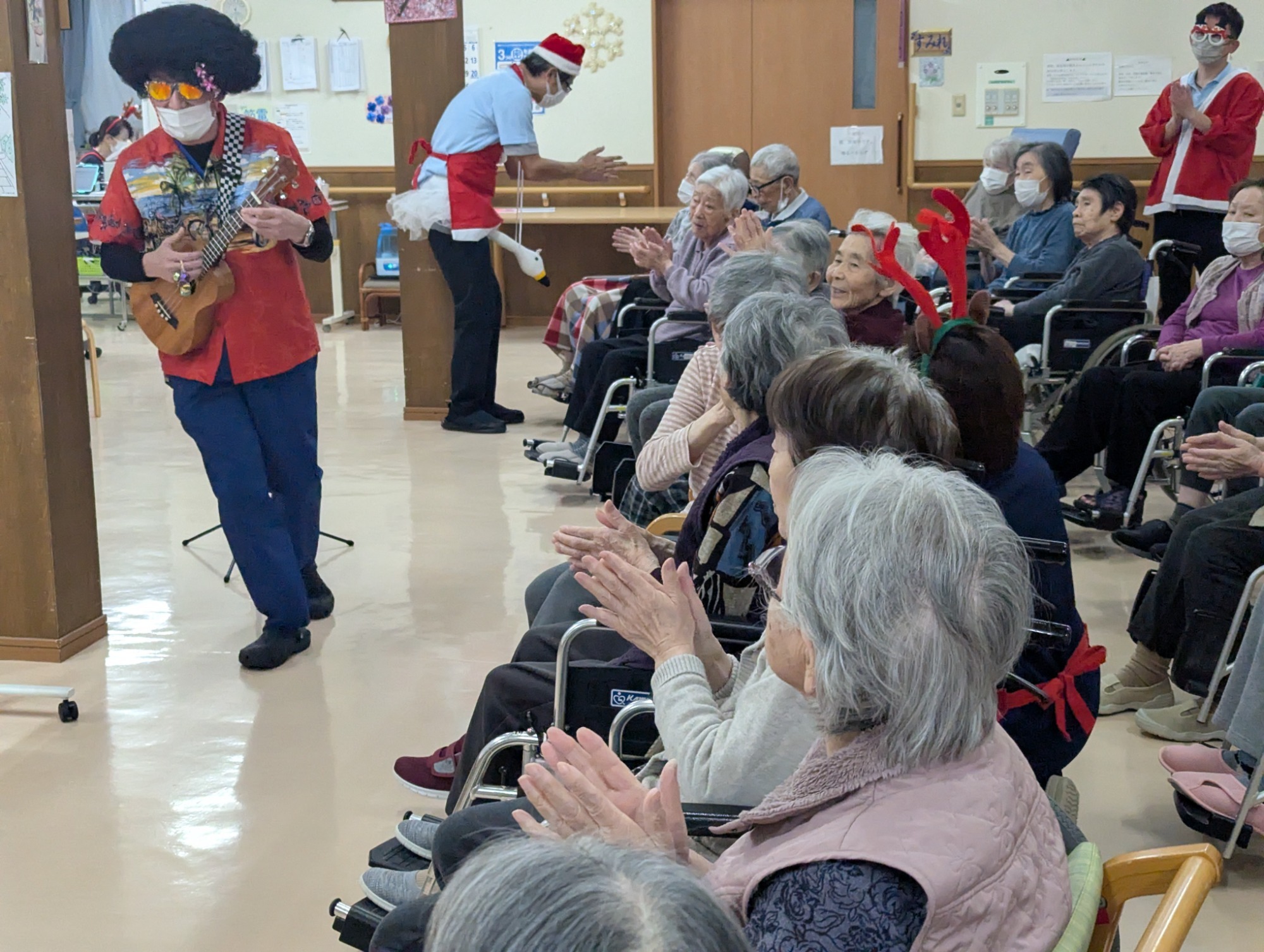 🎄クリスマス会🎄12月25日、ショートステイではクリスマス会が開催されました。今年は、なんと“南国からの迷い人”が登場(笑)!!アフロヘアにハワイアン衣装という強めのインパクトで現れ、ウクレレ片手にクリスマスソングを披露してくれました。続いて職員も負けじと、ジングルベルに合わせてカップスでテンポよくパフォーマンス。会場は笑いとリズムであたたかい時間に包まれました。詳細は、後から掲載されるこもれび通信でご覧ください。