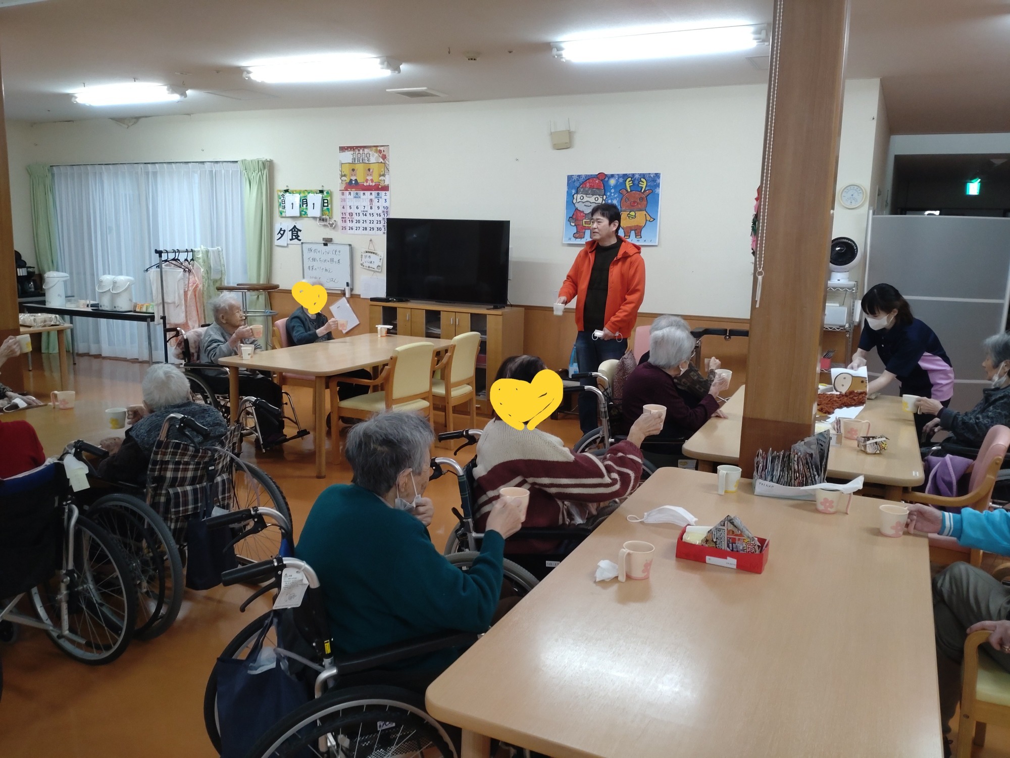 鬼に扮した職員の姿を見るなり、一斉に「鬼は外~福は内~」と丸めた新聞を投げつけ、鬼退治!全力で鬼退治に奮闘したご利用者様も居りましたが、可愛らしいキレイな鬼が居たので、順番に記念撮影も行いました。今年は鬼退治に加え、コロナも退治出来たら…とは思いますが…引き続き感染対策を行いながらも、楽しい時間を過ごしていきたいと思っております。(令和4年2月)
